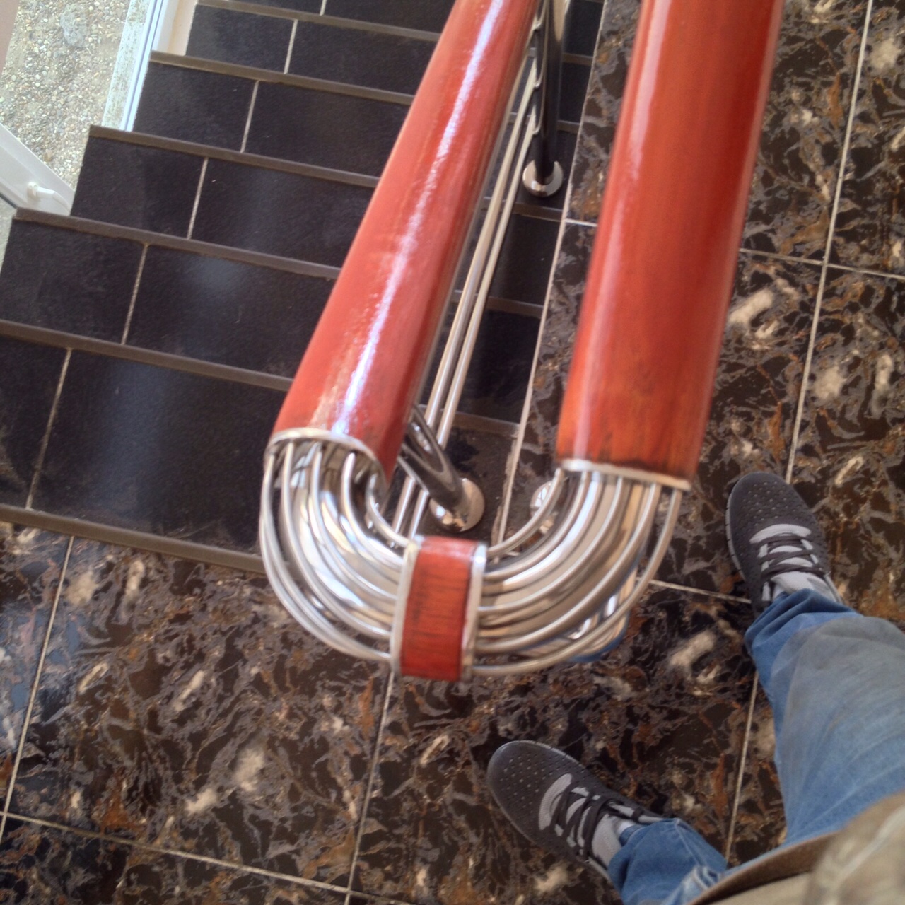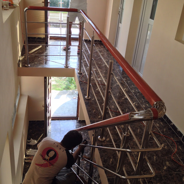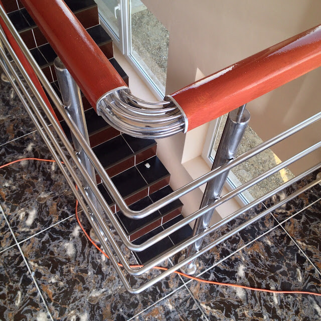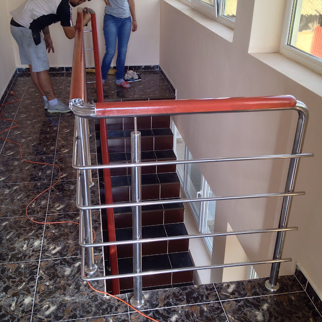 Astfel, peste teava din inox s-a aplicat mana curenta din lemn masiv(lacuita cu nuanta aleasa de client) iar la intoarceri au fost aplicate coturi din sarma de inox.